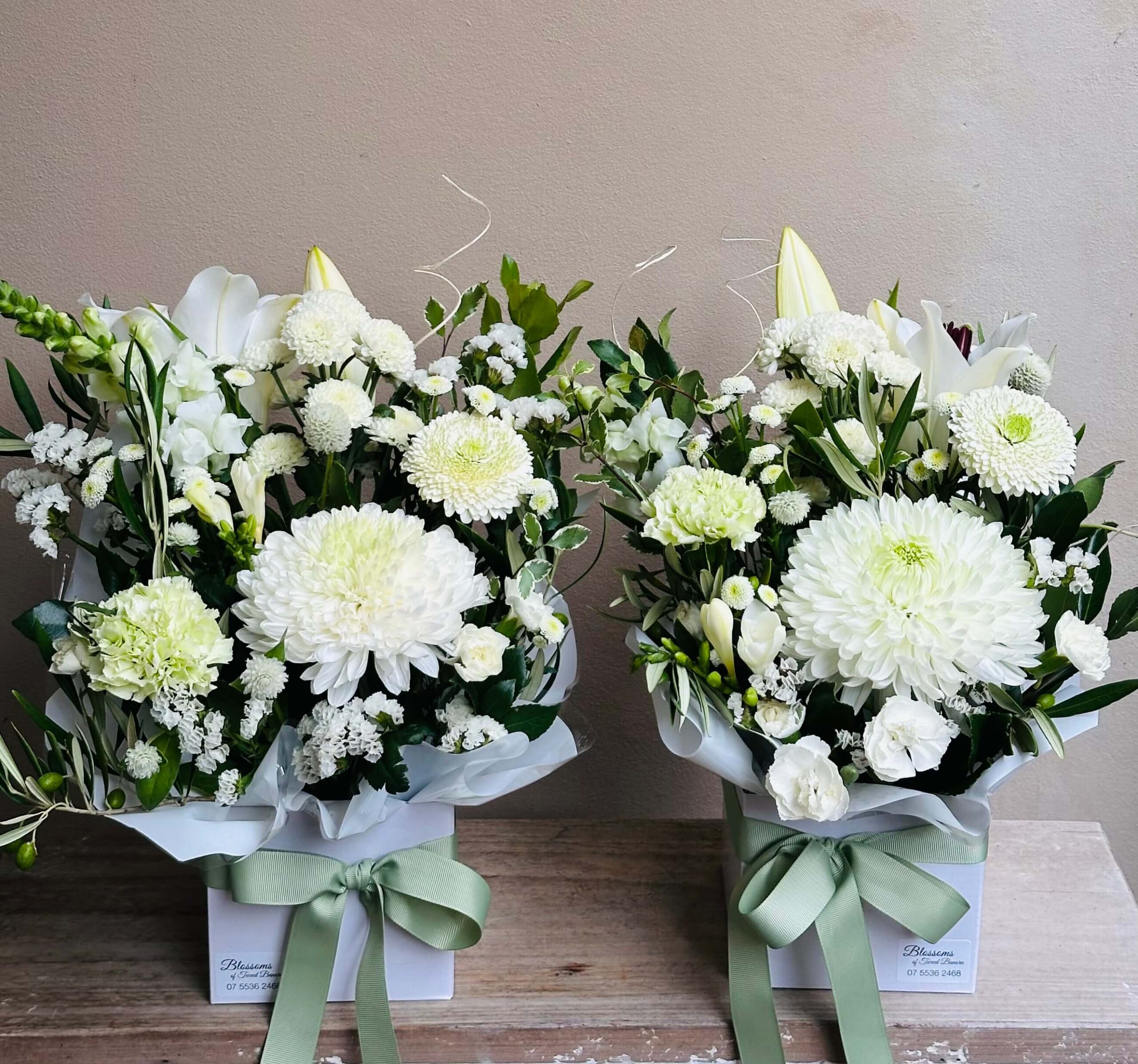 Using a selection of seasonal white flowers and various lush foliages, I arrange the flowers into a box in a garden style, front facing arrangement.